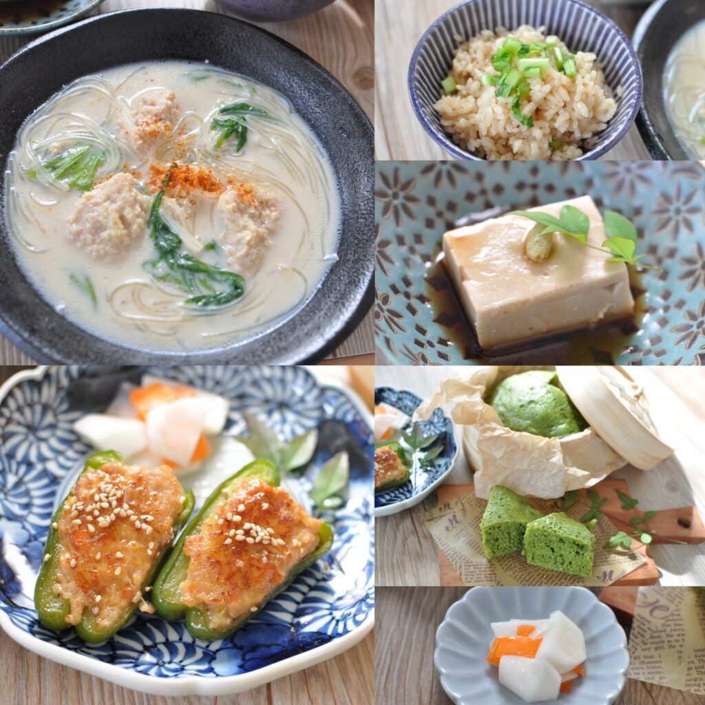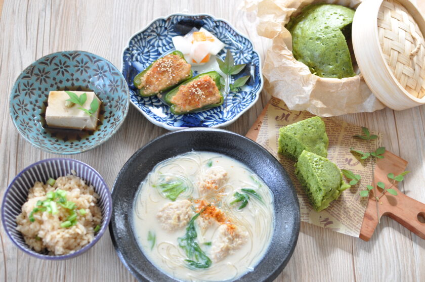 2025年11月のレッスンは、ふわふわ鶏団子と春雨・水菜の豆乳鍋風のスープと、和風の味付けでご飯と相性抜群のピーマンの肉詰め&モッチリ食感が美味しい胡麻豆腐を作る和食レッスンです。