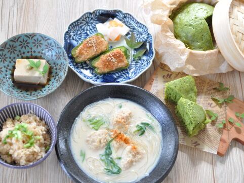 2025年11月のレッスンは、ふわふわ鶏団子と春雨・水菜の豆乳鍋風のスープと、和風の味付けでご飯と相性抜群のピーマンの肉詰め&モッチリ食感が美味しい胡麻豆腐を作る和食レッスンです。 11月のスイーツは...