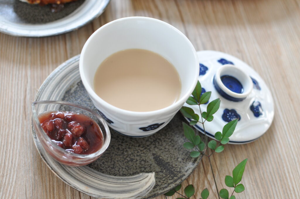 フレーバーティーをミルク入りで作り、甘い小豆を添えてホッとする味わいを楽しんでいただきたいと思います✨