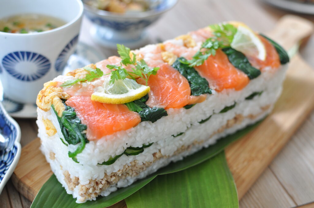 メインとなる、押し寿司は、サーモンや海老を使った定番の組み合わせに、お子様や男性にも喜ばれる鶏そぼろを挟んで作るオリジナル押し寿司です。今回は、牛乳パックを利用することで、押し型が無くても自宅で手軽に作れる方法で作ります。